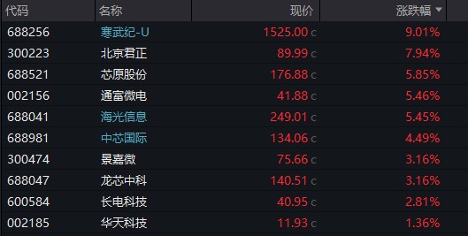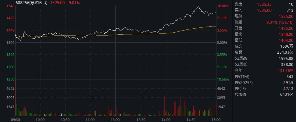 在 GPU 概念股中,寒武紀漲超 9%,股價報 1525 元/股,超越貴州茅台再登 A 股 “股王” 寶座,盤中最高觸及 1548 元/股。海光信息、中芯國際等跟漲