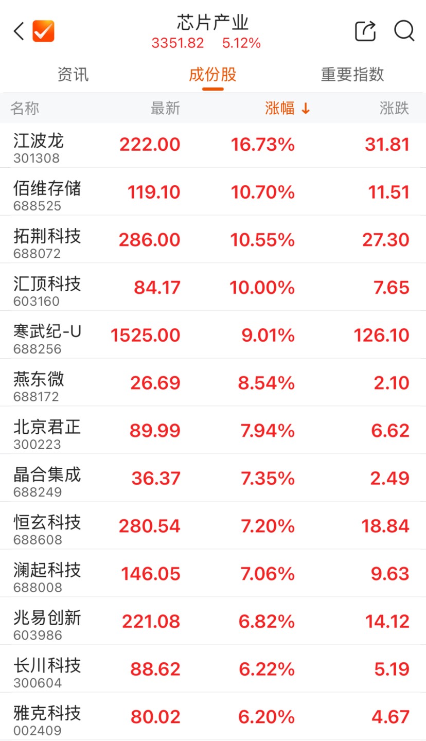 半導體產業鏈爆發,芯片股午後持續走高,匯頂科技漲停,江波龍、佰維存儲、拓荊科技均漲超 10%,燕東微、北京君正、晶合集成等跟漲。
