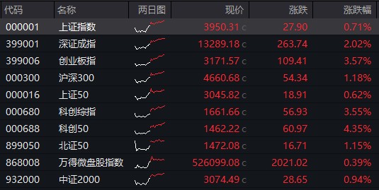 A 股:截至收盤,滬指漲 0.71%,收於日內最高點 3950.31 點,深成指漲 2.02%,創業板指漲 3.57%。科創 50 指數漲超 4%。
