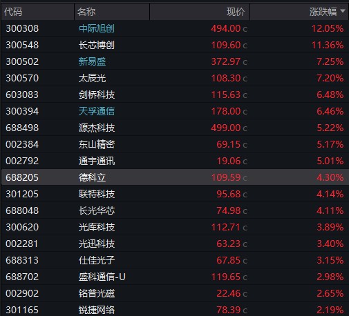 今天午後,AI 硬件股全線爆發,CPO、GPU 等概念股強勢拉昇。在 CPO 概念股中,中際旭創漲超 12%,創歷史新高,市值接近 5500 億。長芯博創、新易盛、天孚通信等漲幅居前。