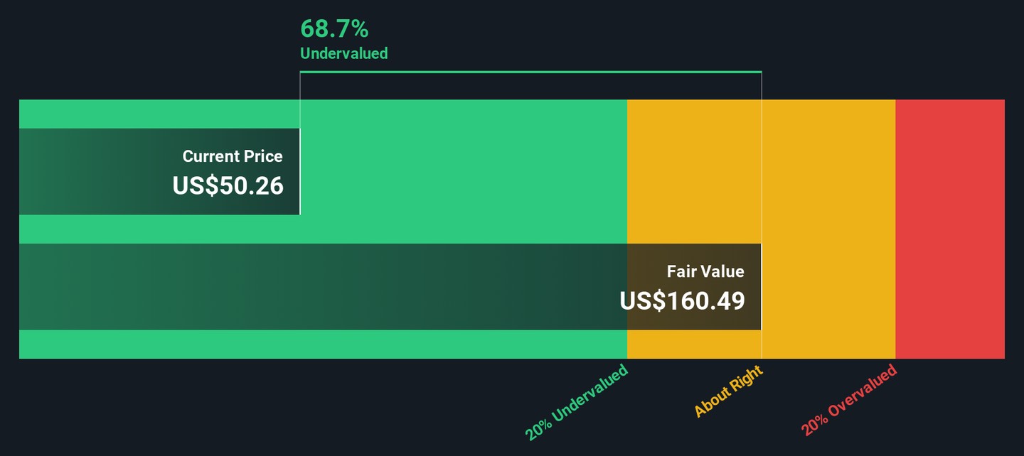When these DKK cash flows are discounted back using the model assumptions, the estimated intrinsic value comes out at US$153.33 per share. Against the recent share price of US$55.11, the DCF output suggests the stock trades at a 64.1% discount to this intrinsic value, which indicates a materially undervalued reading based on this method alone.