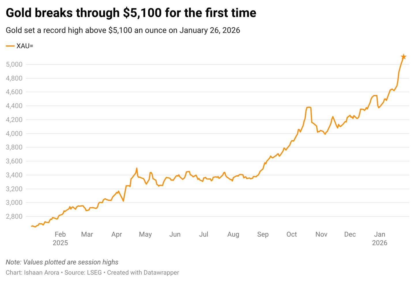 (Updates prices after gold surpassed $5,100/ounce mark)