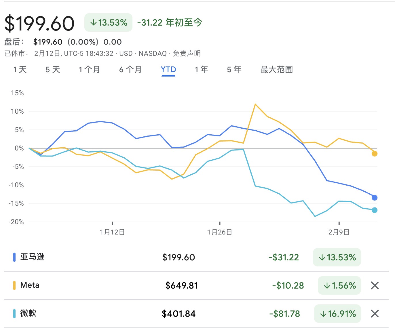 Amazon, Microsoft, and Meta's stocks have suffered greater impacts as investors are skeptical about whether these companies' AI spending will yield sufficient returns. For Amazon, the increase in capital expenditure levels could lead to negative free cash flow this year, meaning the company may need to start entering the debt market to raise more capital.