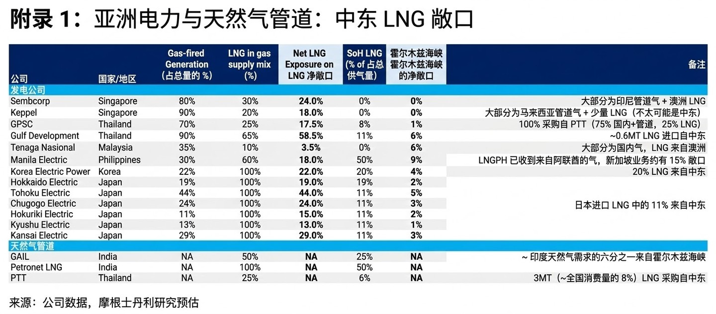 大摩認為,電力、工業和交通三大領域各佔亞洲進口天然氣消費的約三分之一,而亞洲整體佔全球 LNG 消費的一半。其中,印度和泰國在現貨 LNG 方面暴露度最高,而馬來西亞和印尼公用事業公司受燃料供應影響有限。日本和韓國分別有 11-20% 的 LNG 進口來自中東,主要用於發電;新加坡則對中東 LNG 依賴較小。