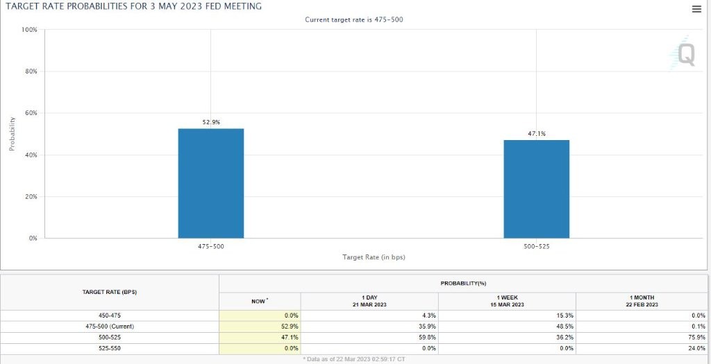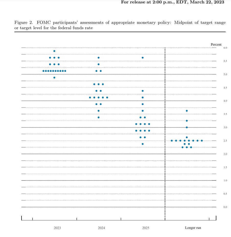 3 月 22 日週三,美聯儲如期加息 25 個基點,令基準的聯邦基金利率升至 4.75%-5% 目標區間,為 2007 年 9 月、即金融危機爆發前夕以來的最高水平。