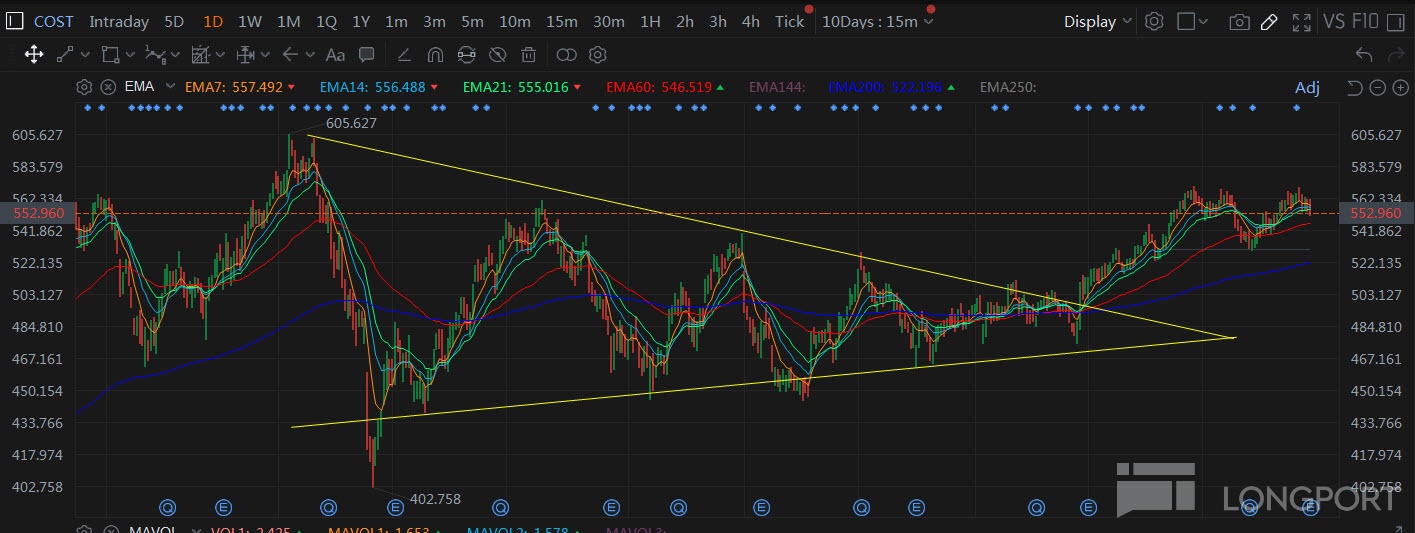 猫猫认为接下来股价回调的可能性比较大,耐心等待山好市多 (COST) 成功突破前高 570 并站稳之后再入场比较划算。