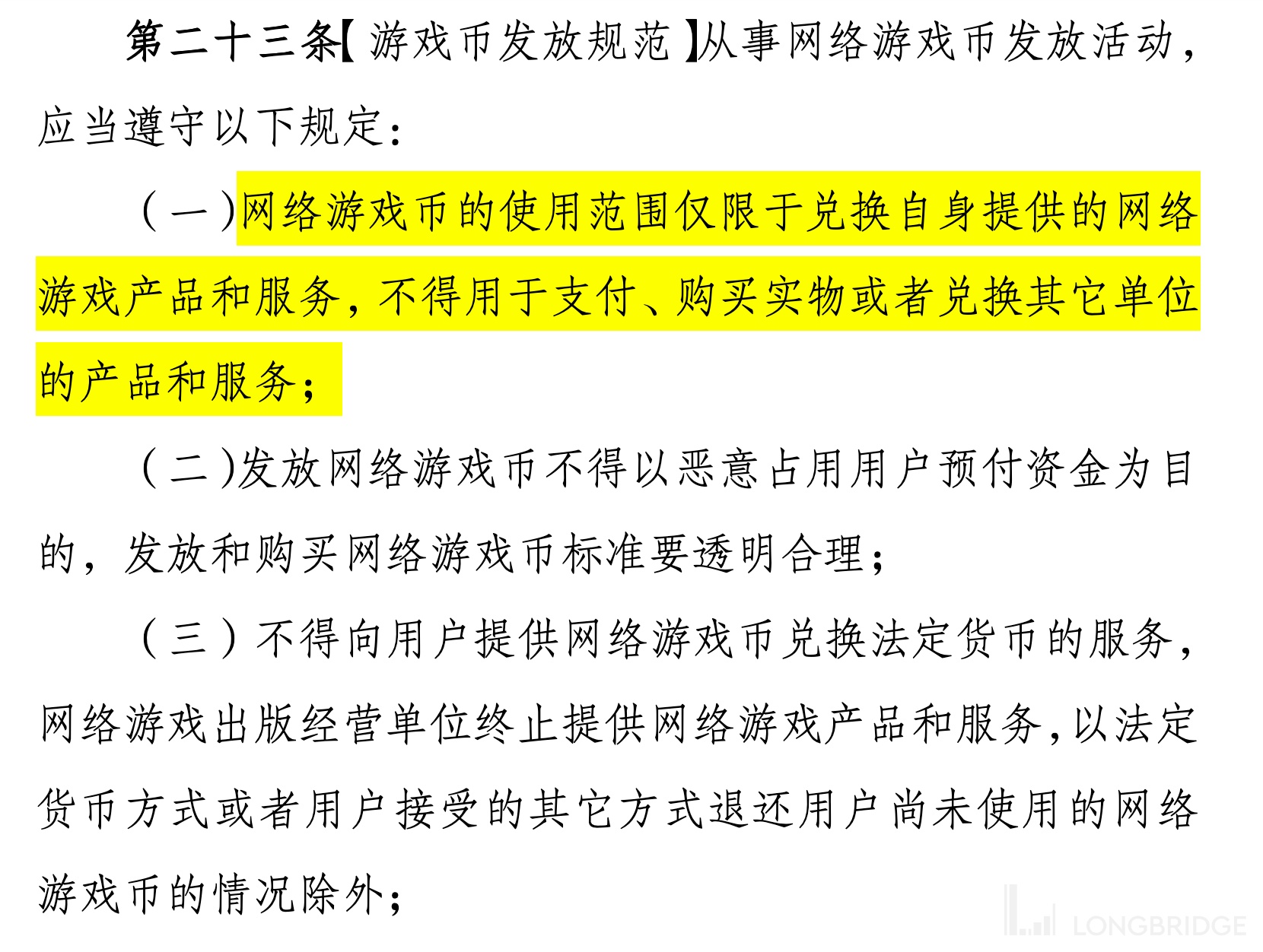 ——伤常青游戏的生态、生命周期。对游戏币的兑换进行限制、遏制高价道具交易、游戏交易平台与游戏开发不能同一家公司等,这条规定的目的可能是为了避免部分不法分子通过游戏币进行洗钱或非法出境。
