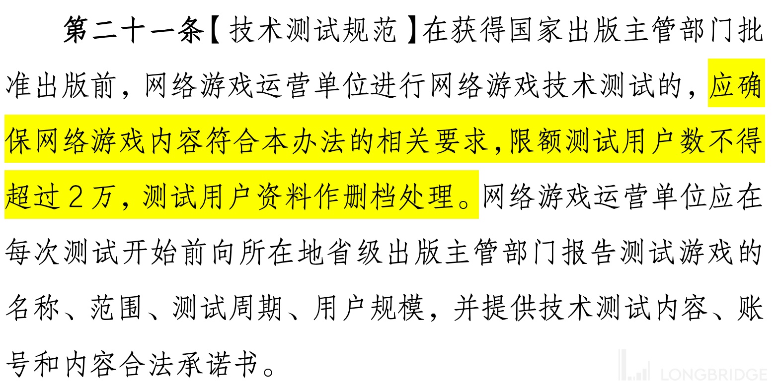 但这条规定,直接给所有游戏划出了一道 2 万用户的红线(目前没有明确说是单次测试不超过 2 万,还是多轮累计)。大企业因为产品经验丰富,可能会基于自身的历史经验在测试量有限的情况下也能调试出相对较优的效果。小企业的低质游戏可能因为本身受众面不大,对测试的依赖性也不高。