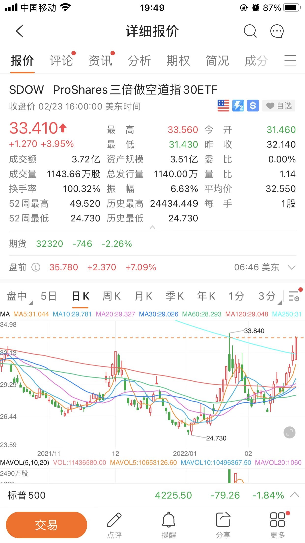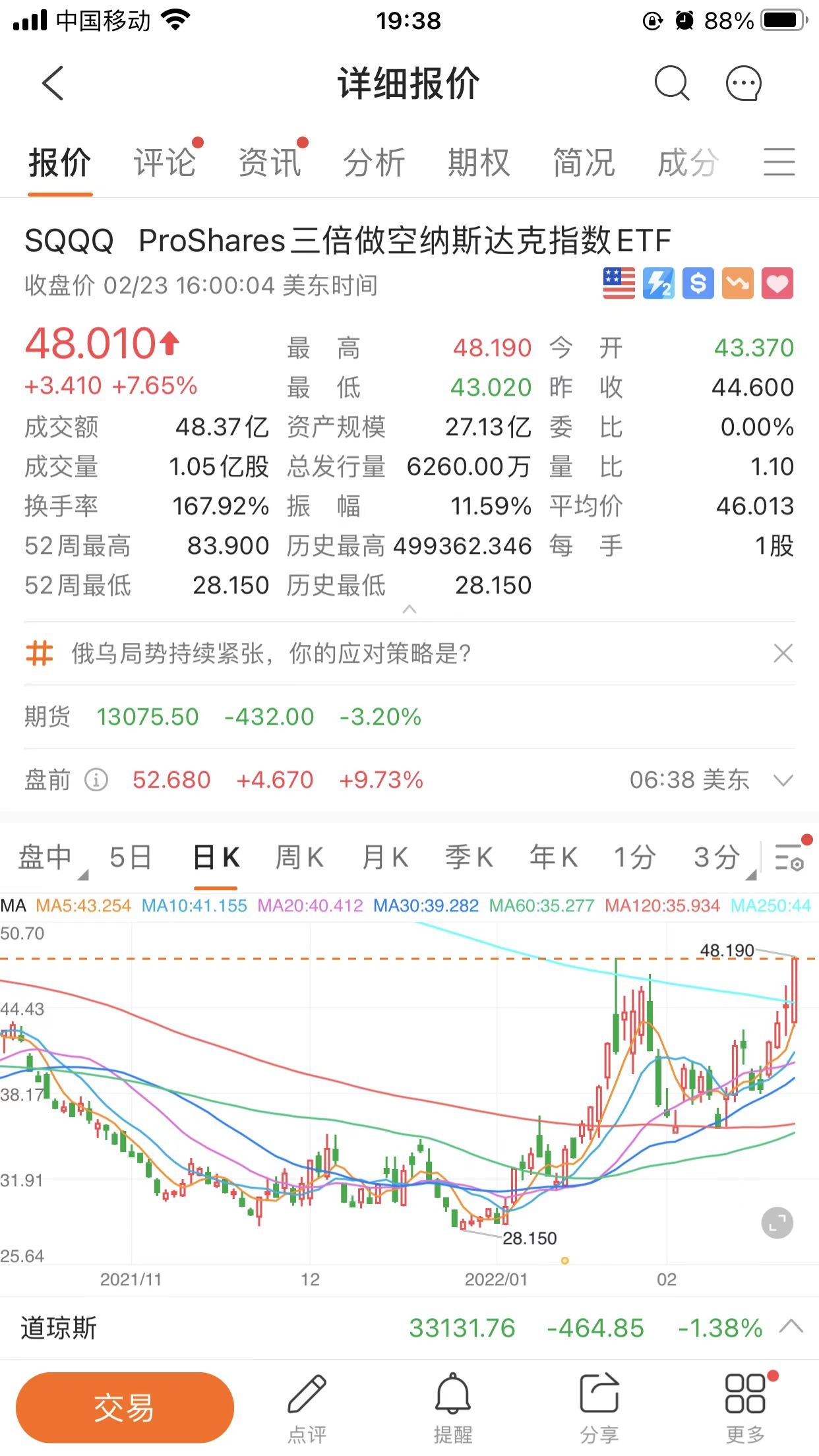 股票代码:sqqq。是三倍做空纳斯达克指数 ETF,跟踪纳斯达克 100 指数。基金的波动和指数反向,纳斯达克 100 指数跌,那他就会涨,并提供单日三倍杠杆。即指数跌 1,基金涨 3。最近美股也是一直跌跌不休,而老俞两天买了 SQQQ,今天盘前已经涨了 7 个多点了