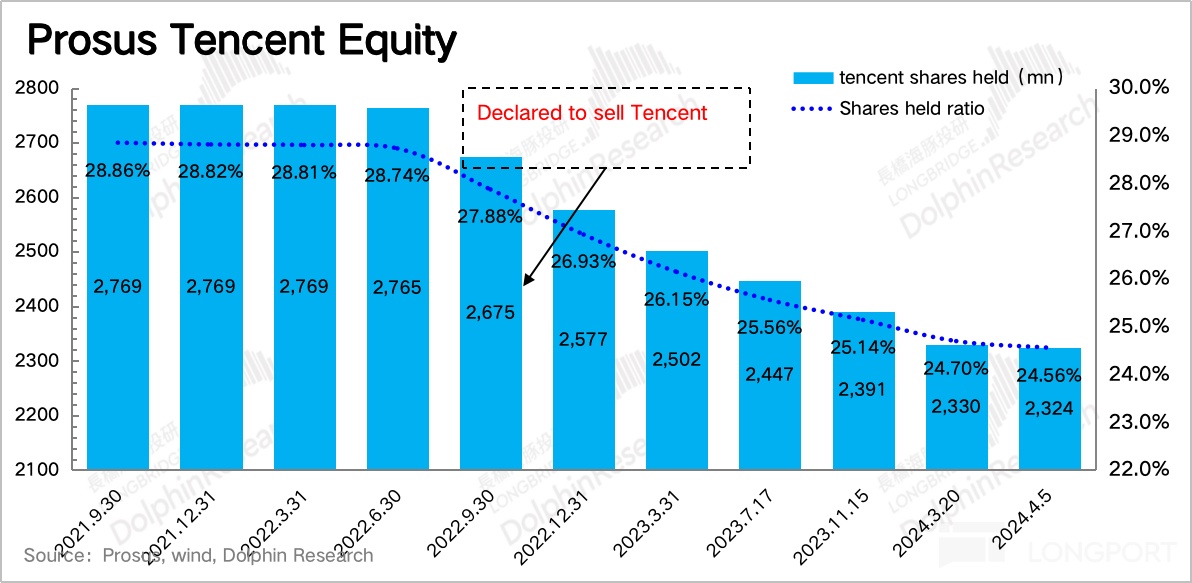 客观来说,企业内生价值取决于基本面。但交易面上,从 2022 年中开始大股东 Naspers 和 Prosus 对腾讯的持续性减持,以及本身港股市场交易情绪的冰冻,也减弱了估值支撑。