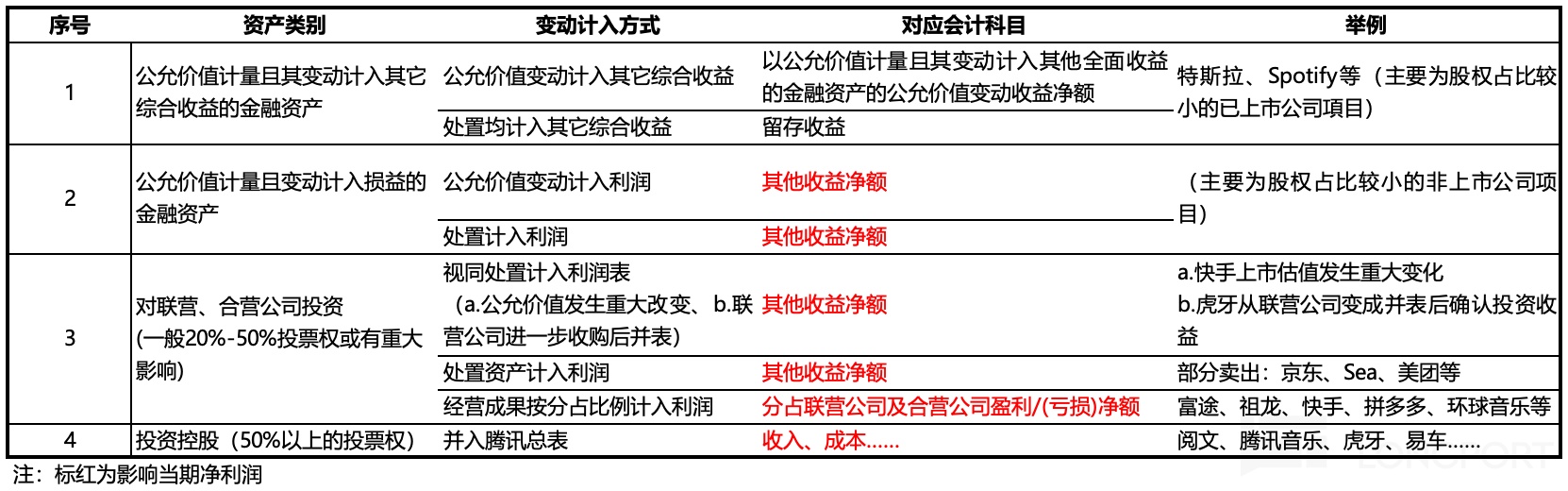 五类资产中,(1)~(4)项都表示为对外部企业/项目的投资,(5)一般为理财类资产。在对这类资产增加投资的同时,腾讯也会处置/退出一些资产项目。关于如何影响当期利润的问题,海豚君也在《再谈投资》中重点介绍过,这里仅贴一个汇总图,不另作赘述。