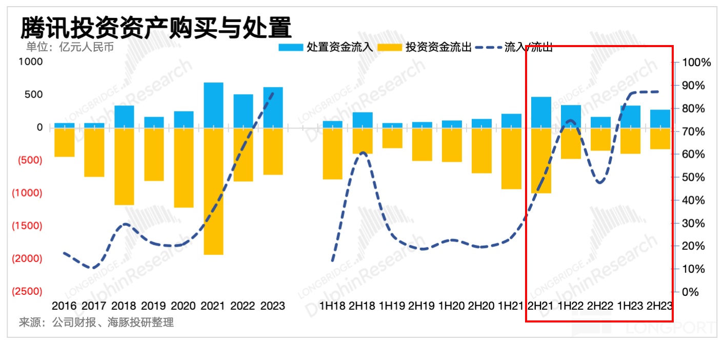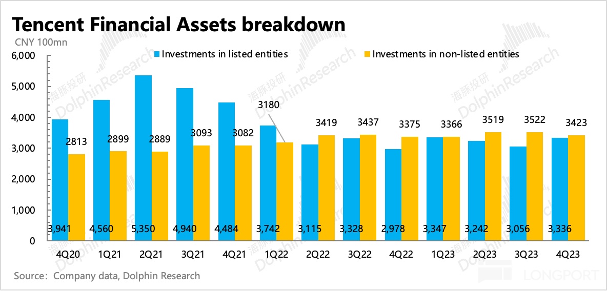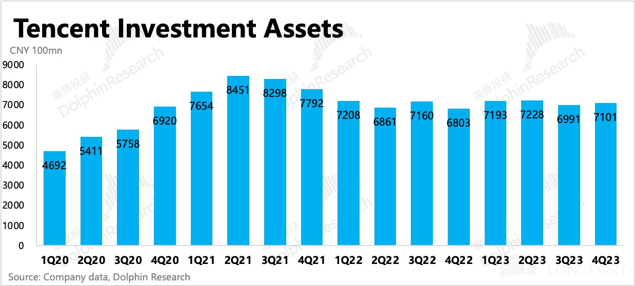 这其中不仅有腾讯资产净卖出的原因,也有资本市场估值整体下移的原因。当然如果撇除后者,通过不考虑市值波动影响的账面价值来进行对比,2021 年上半年最高值 8451 亿,与 4Q23 的 7100 亿之间的差值,则主要就是资产抛售产生。