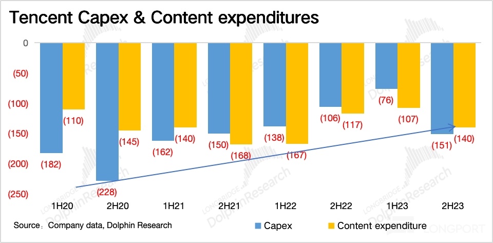 在这个前提下,腾讯将比往年多出来的 “闲置资金”,主要用在了扩大回购规模,同时也减少借款净增加(多为海外投资时的美元贷款,借少还多),而其他现金用途,比如与主业间接相关的资本开支、内容采购规模变化不大,并未随着收入增长而同步扩张。