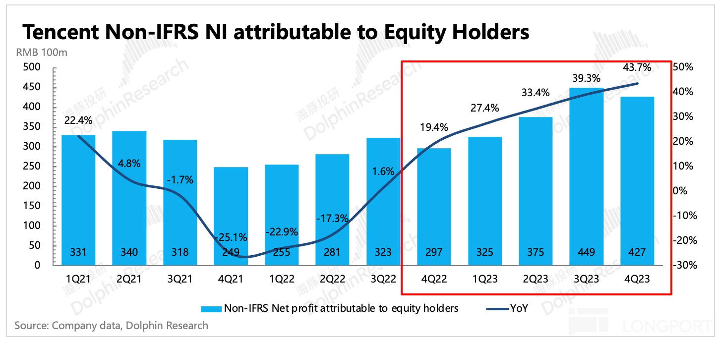 经过 2022-2023 两年努力——聚焦核心优势主业,数字内容已经几乎摆脱亏损,腾讯云的毛利率也已经转正。这带来的一个最直接的变化就是,尽管收入增长停滞不前,但对长期股东来说更重要的盈利端——集团的 Non-IFRS 归母净利润规模扩张并未掉队。