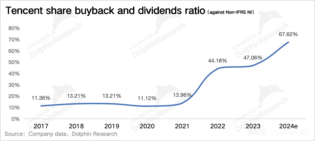 与此同时,腾讯的派息比率(股息/Non-IFRS 归母净利润)也在稳步提高。将回购和派息汇总来看对股东的总分红回报,占净利润比重已经从 2017-2021 年的 10% 左右,光速提升到了 2023 年的近 50%。而按照公司对 2024 年的预期,海豚君粗略算了下,分红 + 回购占比可以进一步提高到 67%。