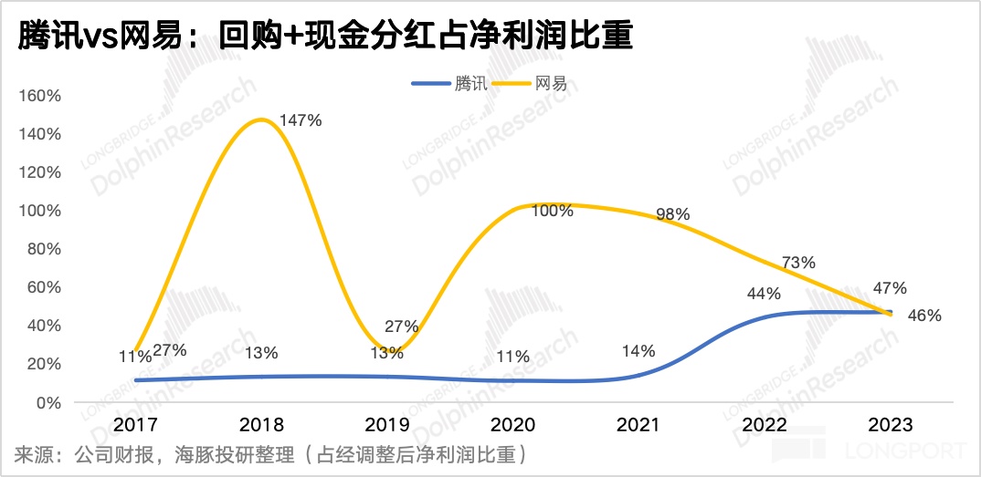 尽管主营业务各种爆金币一样的血赚,但在 2022 年之前,腾讯对股东着实称不上大方——每年一次派息 + 鲜少的回购,至少和同样身处暴利行业的游戏龙头网易来比。
