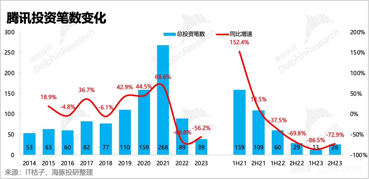 根据(1)的要求,海豚君梳理了 2021 年之后腾讯投资活动,主要体现出的投资风格为:出手更少,聚焦主业 + 创新。