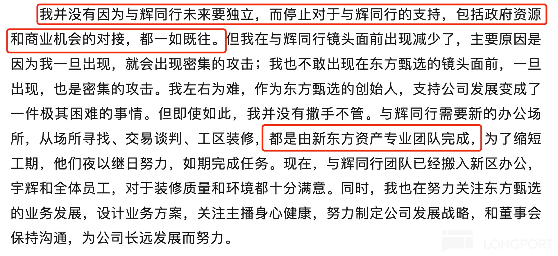 但不管怎样董宇辉与东方甄选切割,与董事长俞敏洪的关系始终未断掉,在一定程度上,甚至可以说两人是存在利益捆绑的。(与辉同行独立后的新办公室由新东方资产专业团队完成落地,且俞敏洪承诺会给与辉同行提供政府资源、商业机会)