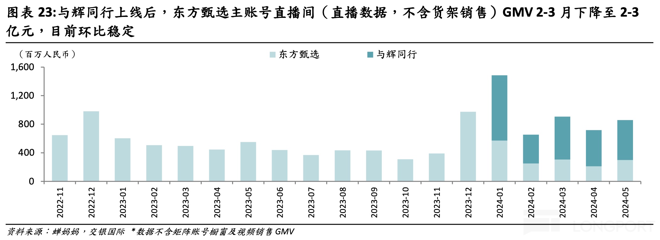 另外,我们考虑到没有了董宇辉的东方甄选直播间虽然受影响较大,但 GMV 也并没有直接脚踝斩,而是和与辉同行实现了共赢——带动东方甄选集团整体 GMV 增长 50-100%。