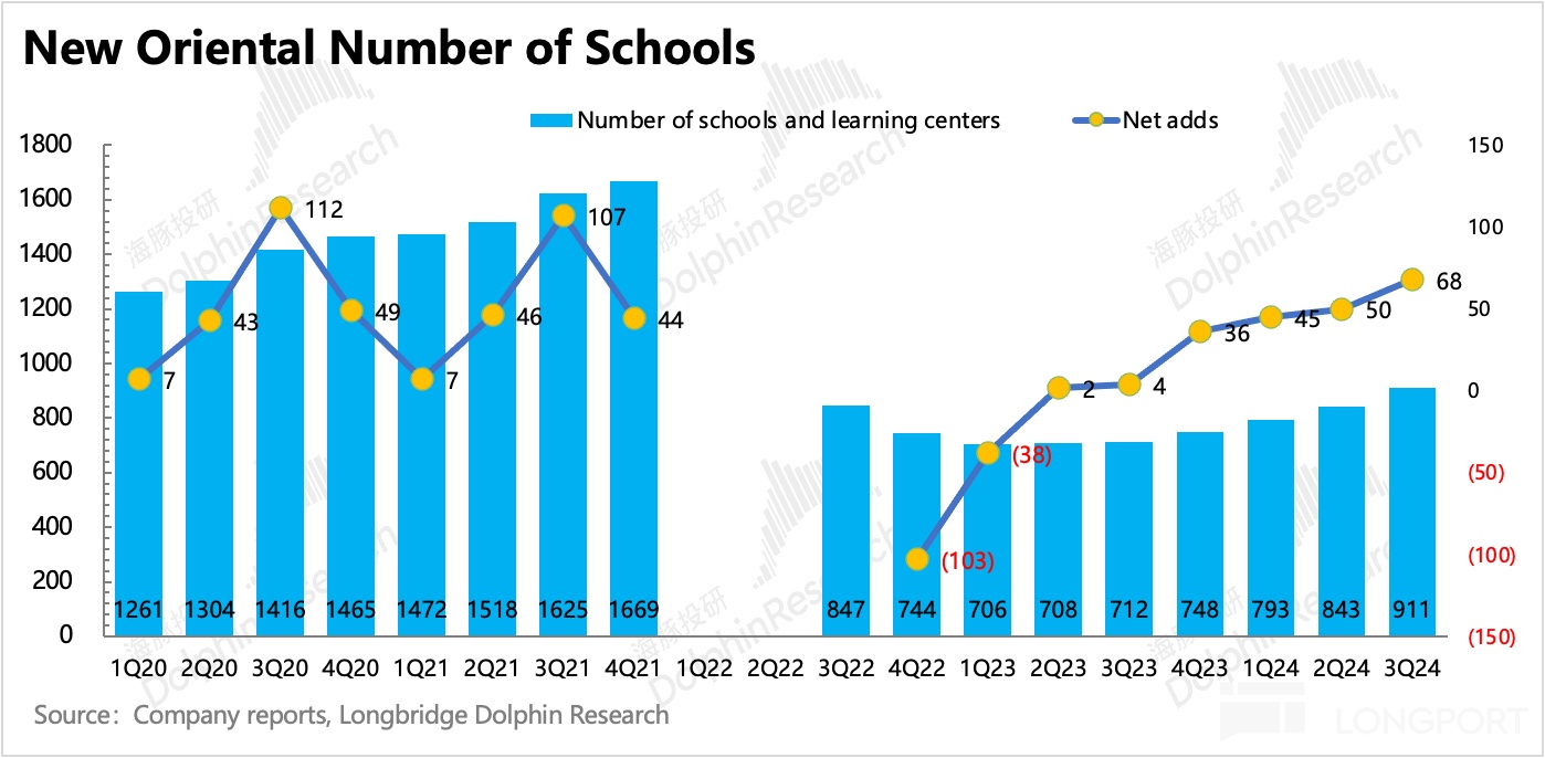 除此之外,海豚君对上季度业绩还相对积极的原因在于,新东方进一步加速了学习中心的设立。虽然短期难免会影响利润率提升的进度,但在我们看来,这个表明供不应求状况还将持续一段时间(新东方管理层在双减之后,对于扩容的节奏一直比较谨慎、理性)。