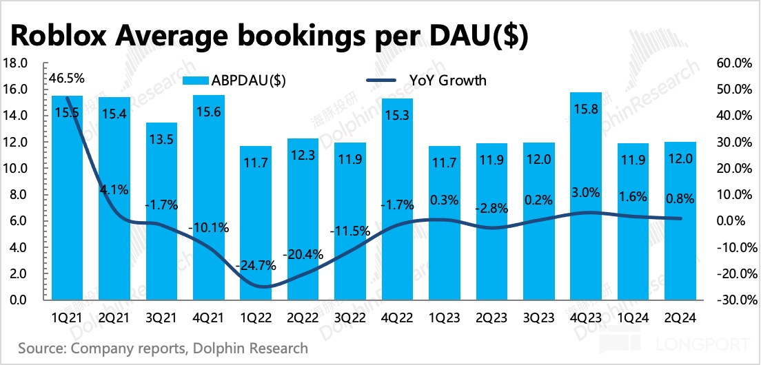 两场活动加持下,Roblox 的用户生态在淡季中逆势扩张。二季度用户整体净增 180 万,主要是 13 岁以上用户群体,增加了 150 万。全平台用户整体达到 7950 万,其中 4640 万为非儿童用户。考虑到视频广告也仅面向 13 岁以上的用户展示,因此这群用户规模的扩张趋势还是比较重要的,需要持续关注。