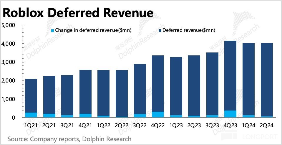 对于 Roblox 这种订阅流水前置,经营支出中占比较大(25%)的开发者分成支出滞后的优秀商业模式,正常经营周期下,只要盯着 Bookings 就好,最多再根据递延收入看看未来短期趋势。