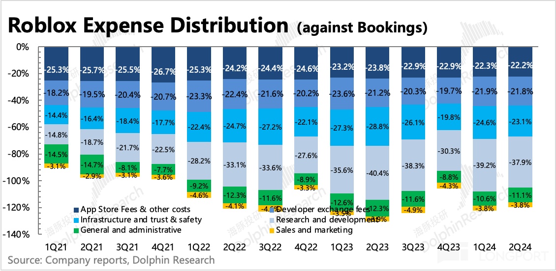 但绝对部分的费用还是跟流水高度相关,海豚君在《Roblox:吞不了元宇宙的 “大饼”》中重点提及过 Roblox 确认收入和成本费用的方式,因此从 “费用/Bookings” 的角度来看费率变化更贴合实际经营情况。