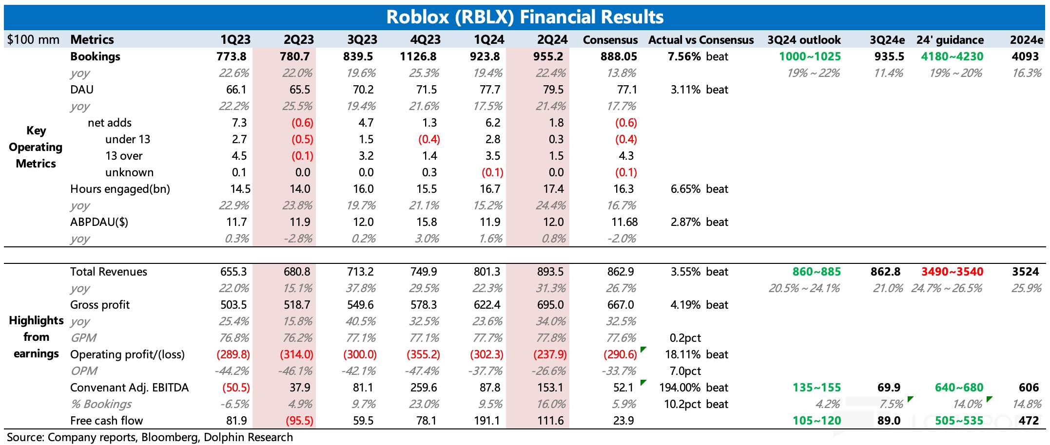 $罗布乐思(RBLX.US) 美东时间 8 月 1 日美股盘前发布了 2024 财年第二季度业绩。二季度的经营情况较一季度有很大改善,关键指标 Bookings 和亏损情况都明显超过原先的指引。此外,管理层还将 2024 全年指引都进行了上提。
