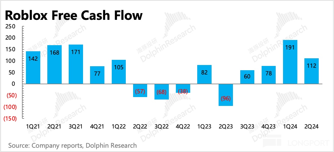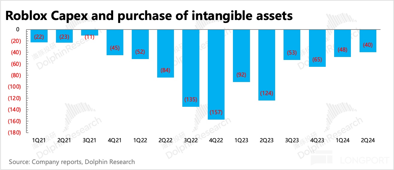 二季度 Roblox GAAP 下的经营亏损环比继续有明显收缩,主要由于通过过去一年来持续削减 Capex,降低了基建费用。此外,对经营费用也严格控制,研发费用和销售费用同比降速。