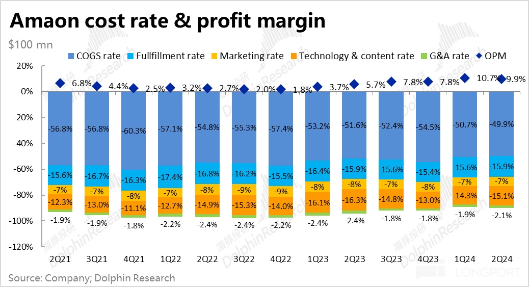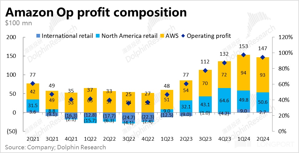与其他 Mag7 股份可能绝大部分的看点都围绕于 AI 相关(或者衍生出的自动驾驶等),亚马逊目前的叙事和投资逻辑中,AI 的比重并没那么大。除了 AWS 能够受益于 AI 带来的增长需求外,零售业务的利润率改善至少是一个平分秋色(如果不算更重要)的关注点。
