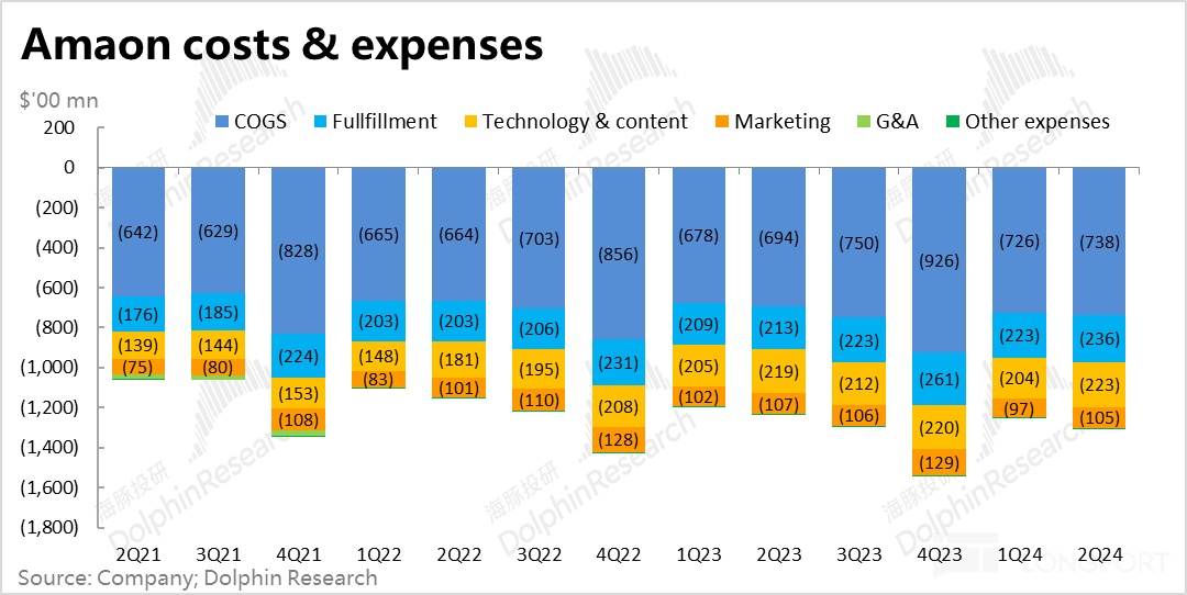 4. 成本和费用角度:① 虽然营收增长降速,但本季的毛利率却是环比提升的,环比拉高了 0.8pct。可见因云计算、广告等高毛利营收比重的提高,亚马逊的毛利提升是一个能相对穿越周期的长期趋势。② 费用上,营销和管理费用仍比较克制,费用率环比并没多少的提升。主要是研发和内容支出费用率环比大幅提升了 0.8pct。除了会员视频内容是的投入外,AI 相关研发人员和设备大概率是提升的。和同行类似,可以看到亚马逊对费用投入仍是比较谨慎的,AI 相关的投入甚至可以说是被迫的不得不投。