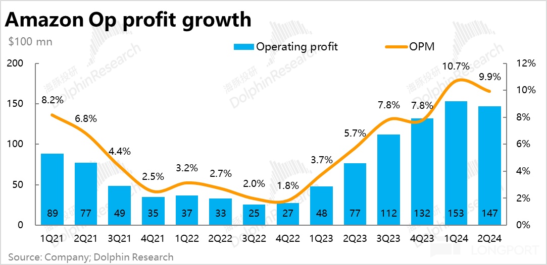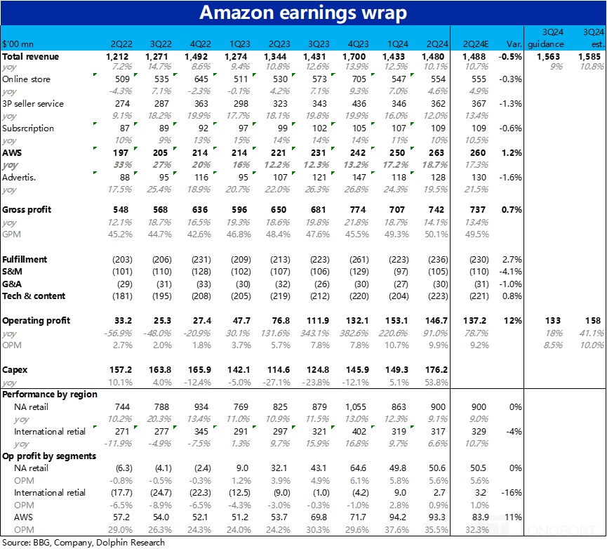 营收层面,受零售业务的拖累,整体是略不及预期的。利润层面相对好些,比预期略好。具体上,本季整体经营利润 147 亿美元,好于卖方平均预期的 137 亿,也高于先前指引上限的 140 亿。不过参考亚马逊实际交付一般都略高于指引上限的历史经验,我们认为本季利润应当只是符合买方预期。整体经营利润率为 9.9%,终止了过去连续 5 个季度经营利润率环比不断拉高的趋势,一定程度上会压制市场对公司后续利润率提升幅度的预期。