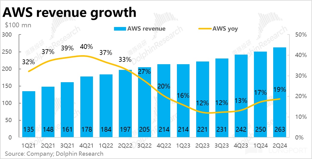 尽管本季亚马逊的整体业绩没有特别明显的亮点, AWS 业务则全面好于预期,实现营收 263 亿美元,同比增速拉升至 18.7%,相比预期和上季增速都高出约 1.4~1.5pct。