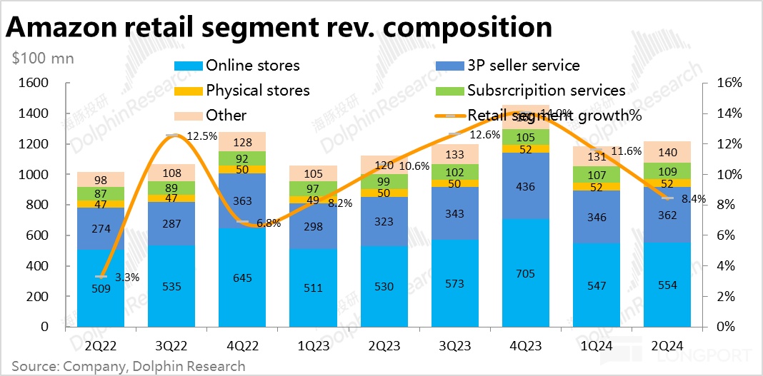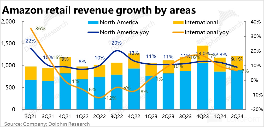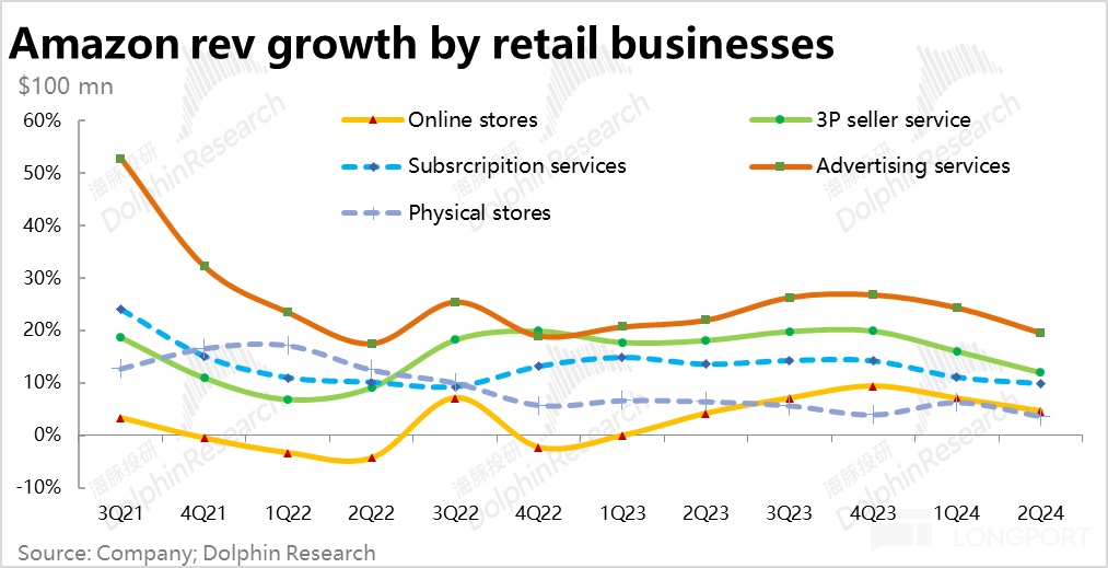 上季业绩时给出的营收增长降速的指引,和近几个月降速的美国宏观消费数据,早已暗示了亚马逊零售板块收入增长放缓的命运。实际上,剔除 AWS 后公司本季零售相关业务的营收增速为 8.4%,环比降速 3.2pct,连续两个季度明显放缓。