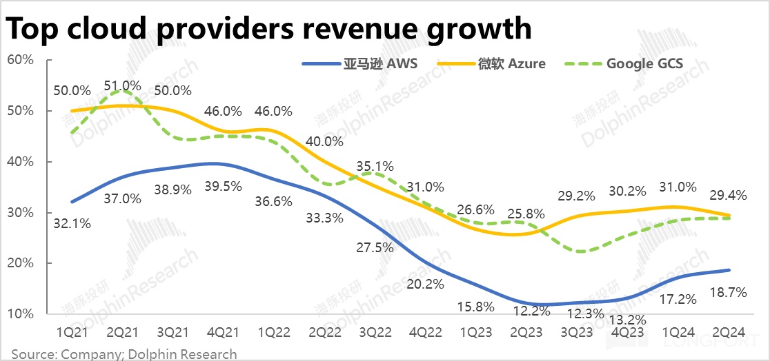 相比之下,本季度微软的 Azure 增速略降,而 GCS 的增速则大体持平,AWS 是三大云计算运营商中增长提速最为明显的。当然一部分原因有 AWS 尚不足 20% 的增速本就明显低于两家竞争对手大约 30% 的增速,低基数下有更多的提速空间。