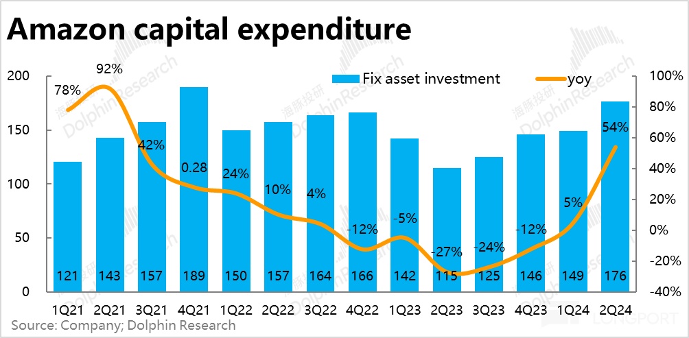5. 此轮 AI 周期,亚马逊相比微软、谷歌、Meta 等其他 Mag7 在 Capex 投入上一直是相对保守的(21~22 年间过量投入的教训惨痛)。本季度公司终于也出现了投入加速的迹象,固定资本开支环比增长 18% 到 176 亿。虽然这正式标志着亚马逊重新进入资本开支扩张周期,但相比同行近乎翻倍增长的投入力度,目前亚马逊依旧是偏于保守的那个,要关注后续 Capex 会不继续大幅拉升。