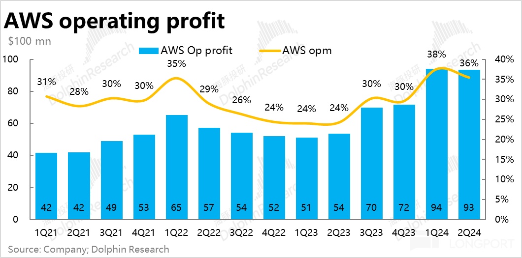 利润方面,AWS 业务(也是唯一一个)的经营利润继续明显好于预期—实际为 93 亿美元,大幅高出预期的 84 亿。虽然经营利润率从上季的 37.6% 环比下降到了 35.5%,但相比保守的预期仍是高 2.1pct。