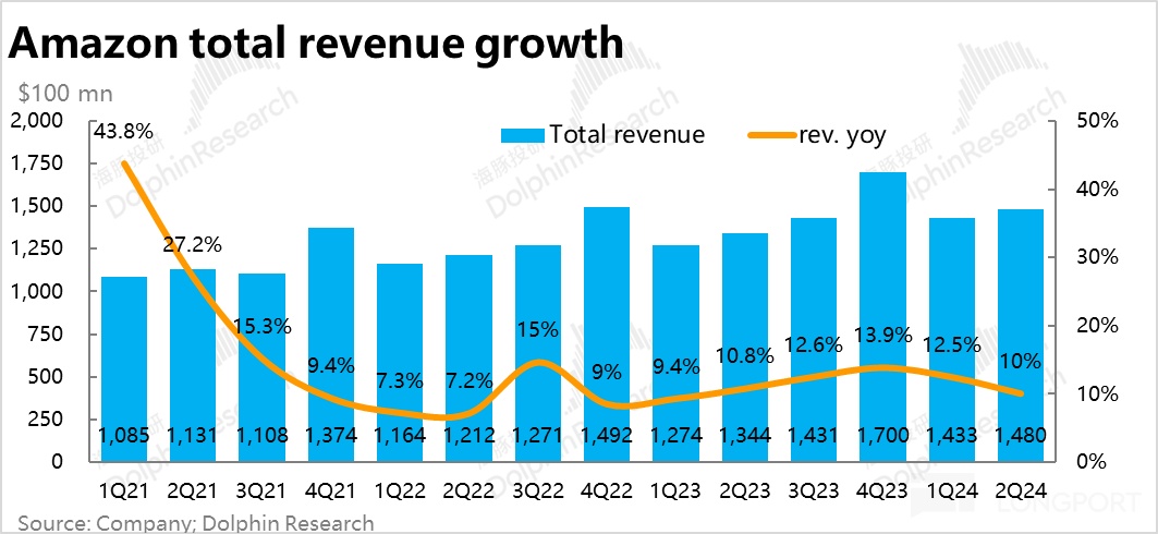 1. 整体业绩上,亚马逊本季实现总营收约 1480 亿美元,略低于指引上限的 1490 亿和市场预期的 1488 亿。同比增速为 10.1%,相较上季放缓了 2.4pct。具体来看,主要是受零售业务增长放缓的拖累,和上季度指引与近期美国宏观消费数据放缓的迹象相符。