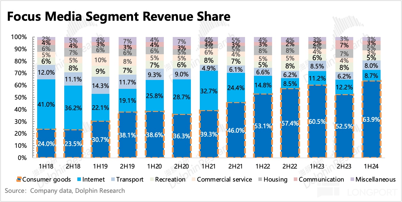 2024 年上半年,分众的第一大客户行业还是消费,占比再次反弹到 64%。占比提升并不是说消费增长不错,实际消费增速也在放缓。但因为互联网、娱乐、本地商业等行业更差,直接同比下滑了,因此消费的占比才被动提升。