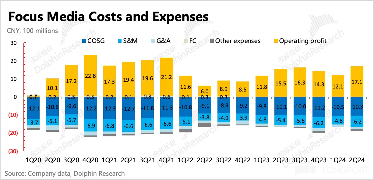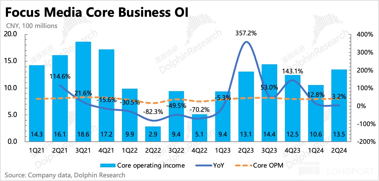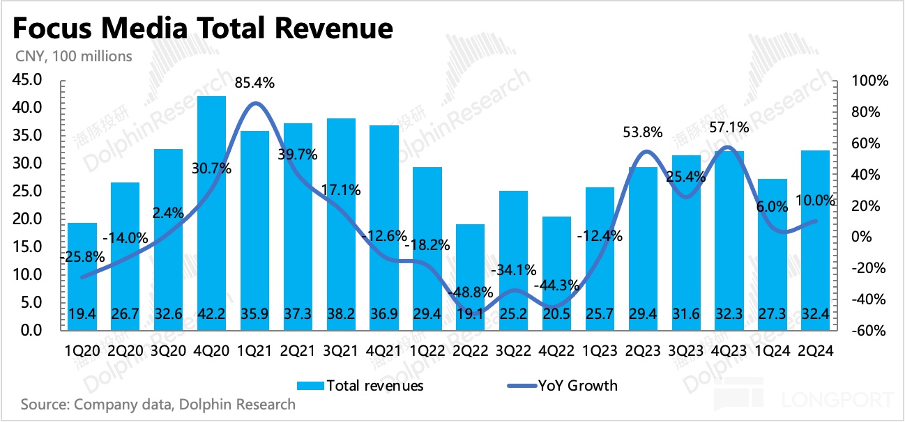 二季度分众的收入增长 10%,显著超出市场预期的 4%。市场预期之所以那么低,源于有低基数优势的 Q1,同比增速只有 6%。这让市场对自带高基数劣势、宏观数据更差的 Q2,很难有正常或乐观的预期。