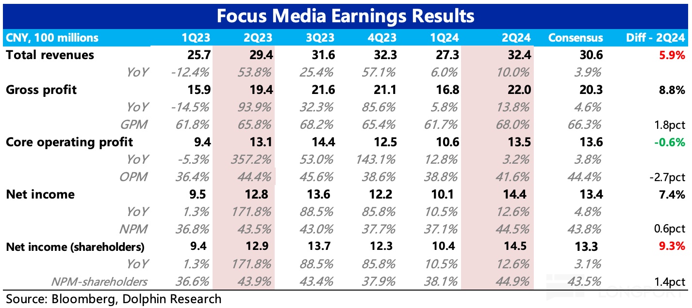 1. 收入大超预期?市场过度悲观了:Q2 分众的收入增长 10%,显著超出市场预期的 4%,也超出海豚君增长 5%-10% 的预期。市场预期之所以那么低,源于有低基数优势的 Q1,同比增速只有 6%。这让市场对自带高基数劣势、宏观数据更差的 Q2,很难有正常或乐观的预期。