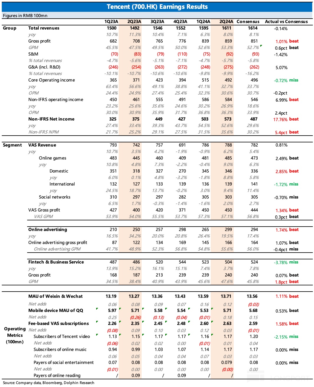 从回购量来看,腾讯继续加大回购,环比增长250%:二季度回购了1.55亿股,耗用523亿港元,购回的股份已被注销,总股份环比1Q24减少0.4%。