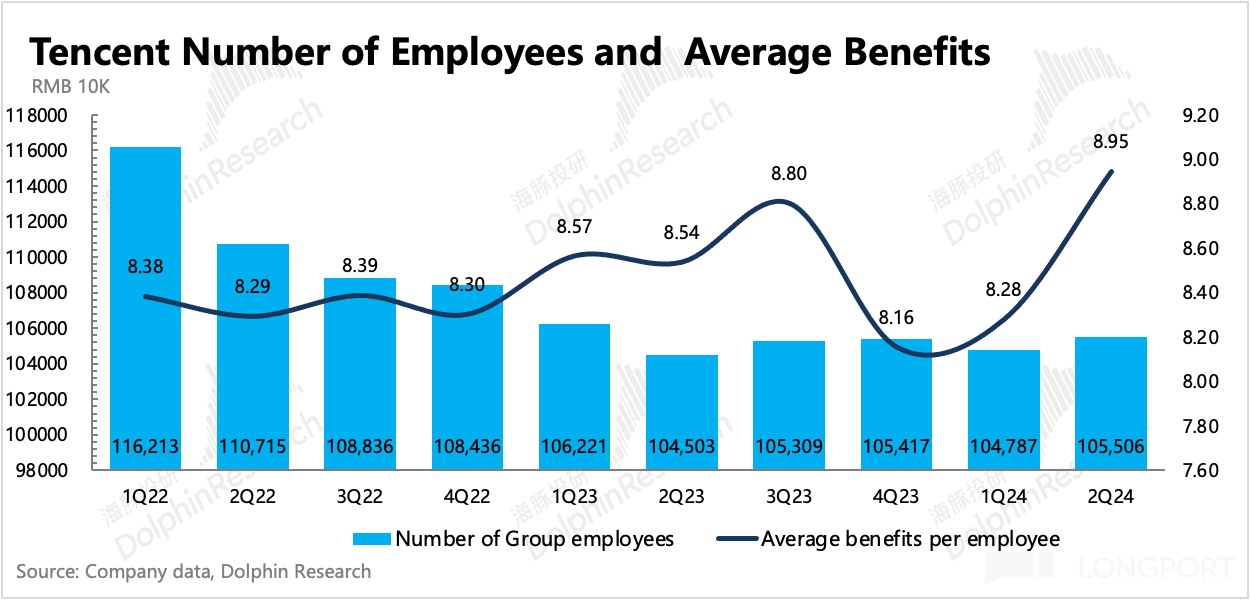 虽然二季度提效趋势再次被打破,但海豚君仍然认为中长期下,腾讯还有经营提效潜力。一方面当下员工规模的绝对体量庞大,相对当前成熟的商业模式仍显臃肿;其次AI等新技术短期需要投入,但中长期对企业的内部效率优化会有更多的帮助。Q2员工新增,并不代表腾讯迈入了新投入周期,考虑到社会影响和短期经营变化,滚动式小步优化仍然是股王战略方向。