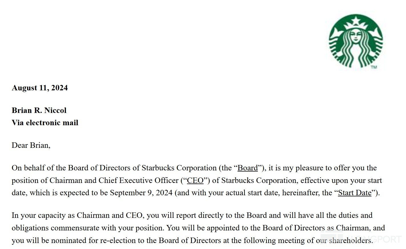 Niccol 和星巴克的合约签署于 2024 年 8 月 11 日,文件显示,Niccol 将首先获得 1000 万美元的签约奖金、7500 万美元的股权赠予。这些股权用以补偿他在原公司 Chipotle 未获得的奖金和股票。