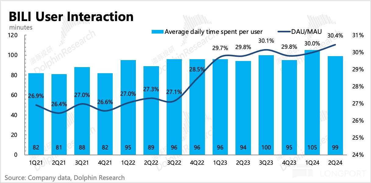 2、存量用户的粘性没什么变化,DAU/MAU 还是 30%。日均用户时长 99 分钟,淡季自然下降,同比增加了 5 分钟。二季度 DAU 为 1.023 亿,环比净流失 10 万。