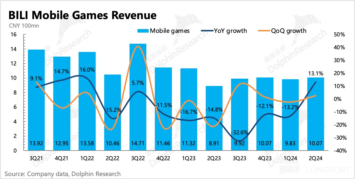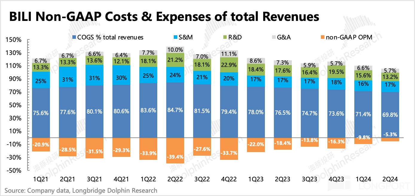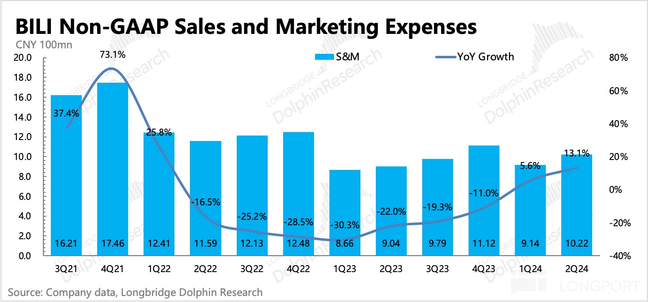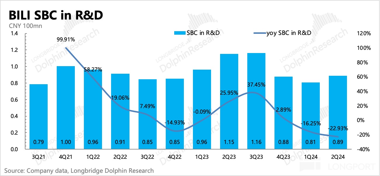 值得一提的是,收入分享成本绝对值环比重新增长,海豚君预计可能主要是游戏分成、Up 主花火广告的高分成(b 站只分 5%,剩下 95% 给 Up 主)带来。