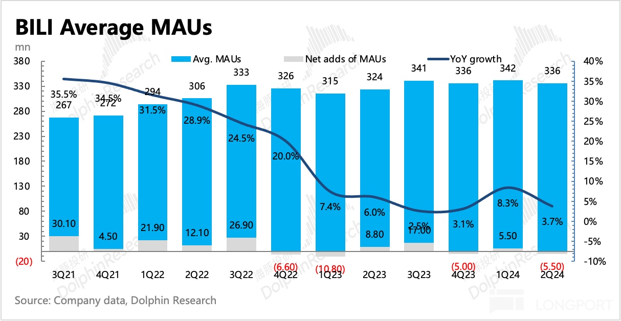 1. 二季度 B 站整体月活(App、PC、电视等)3.38 亿人,同比增长 3.7%,淡季季节性净流失 550 万人。
