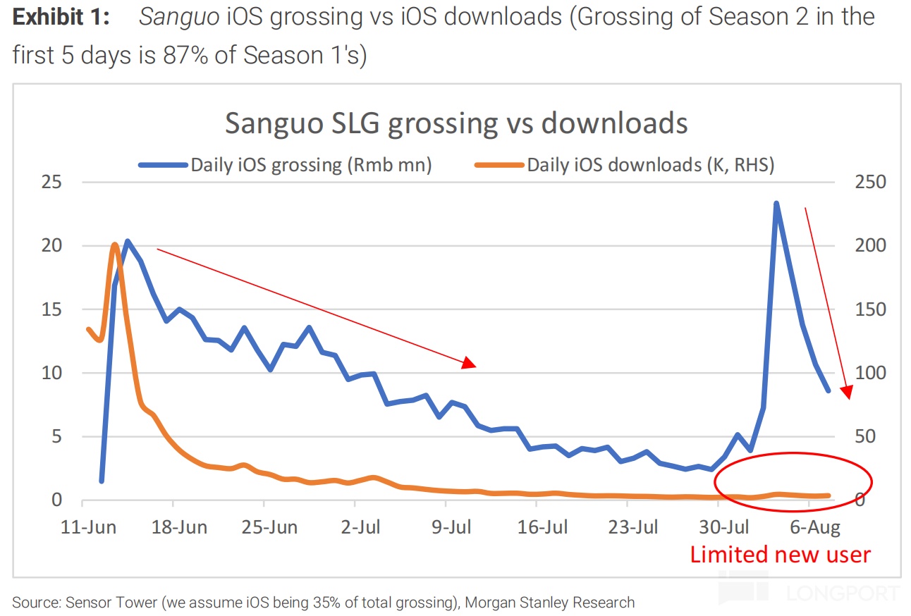 一款《三谋》,保了 B 站今年至明年上半年游戏增长无忧,但考虑到《三谋》说到底还是一款重氪金、重垂类的 SLG 游戏,流水前高后低是这一类游戏的常态,因此持续性仍然是绕不开的一个话题。8 月初《三谋》S2 赛季开启,活跃用户相比 S1 赛季有了一些流失,流水衰减速度比 S1 赛季更快,也能侧面说明一些问题。