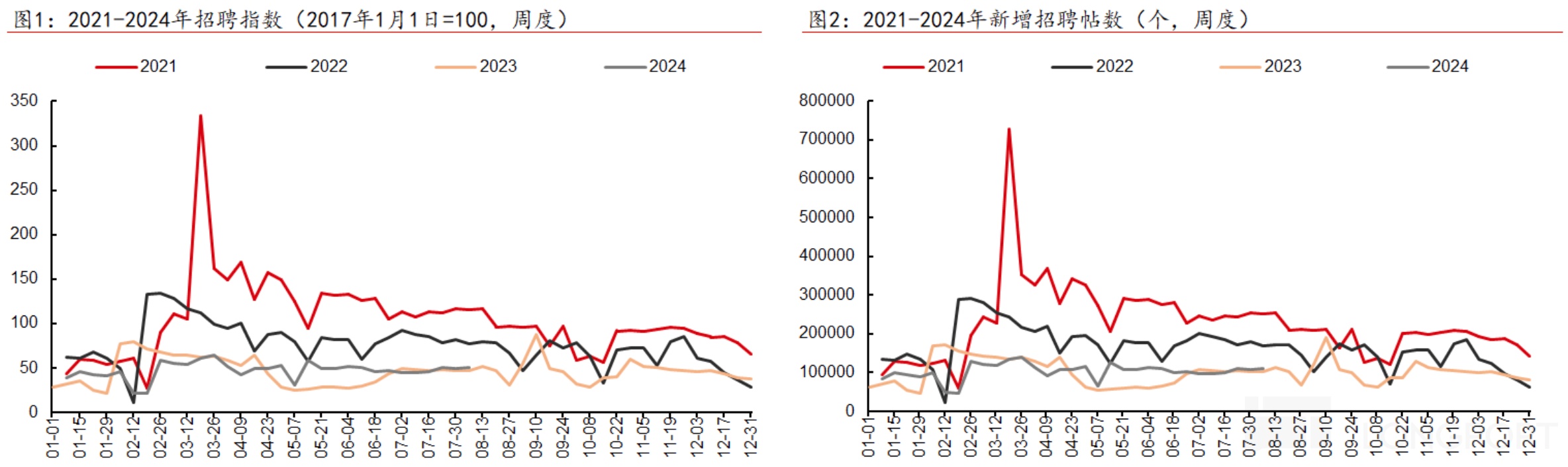 二季度随着毕业季的到来,6 月中信 CRR 失业预期抬头,季末到 7 月城镇失业率也开始反弹。而从剔除 BOSS 直聘之外的平台整体招聘表现来看,也在 6 月之后相比往年平淡。同比上看,几乎与较差的 2023 年持平。环比上看,也未体现毕业季的招聘热度(招聘岗位数、招聘指数未如往年一样环比上浮),由此可见 6 月开始,企业招聘需求迅速转冷。