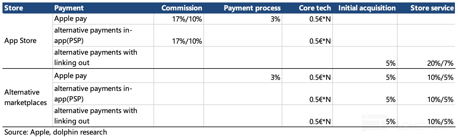 对于苹果,违反DMA的主要就是Apple Store的垄断地位和强制排他性。年初在欧盟宣布判决苹果违反DMA法案,最高将计罚全球收入的10%后,苹果对Apple Store在欧盟地区的收费政策进行了第一次的重大修改,核心点主要是: